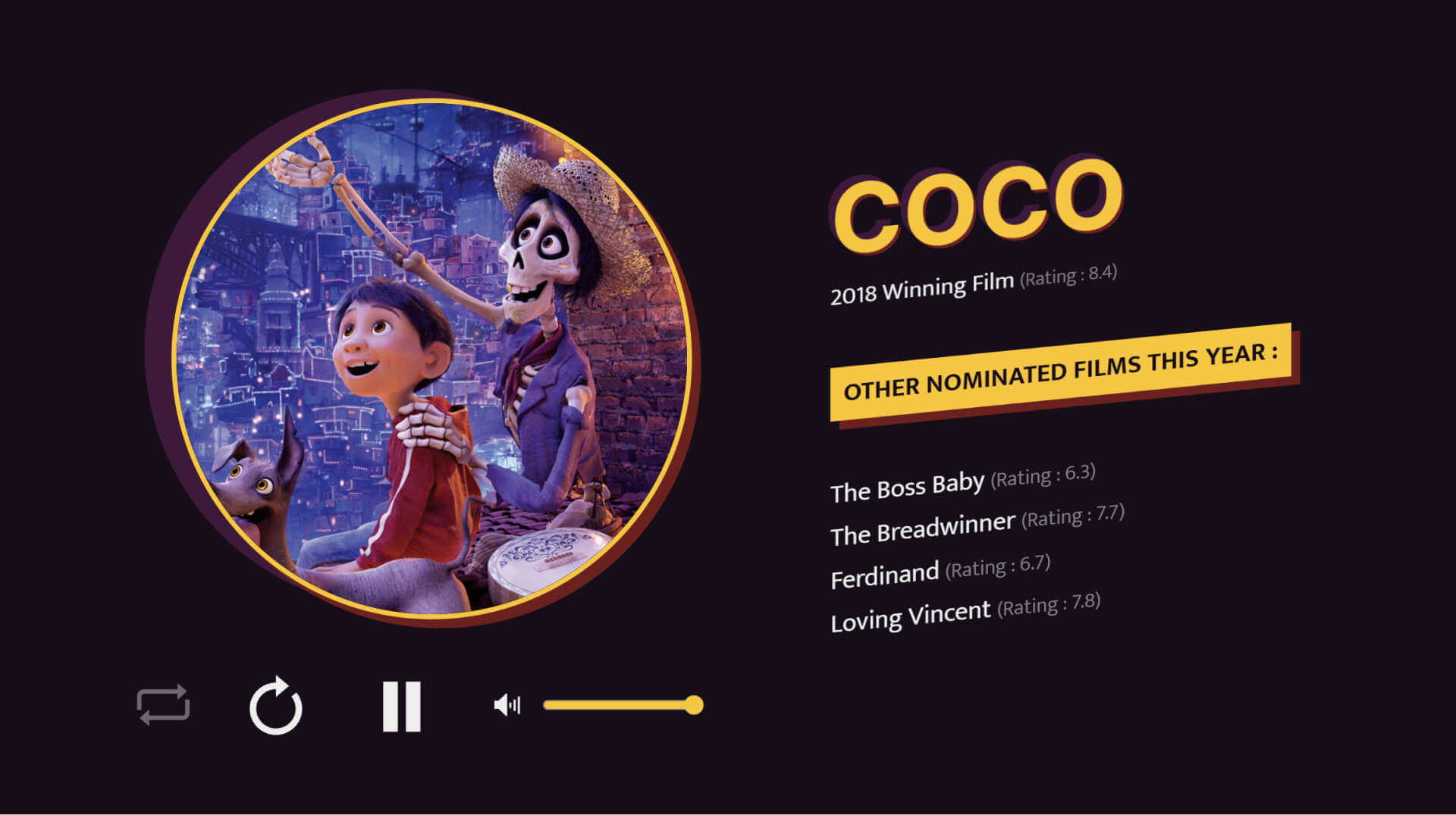 Pour ce projet de groupe, nous devions réaliser un site de visualisation de données dynamique à l'aide de JavaScript. Nous avons choisi d'illustrer les données sur les films nominés ou gagnants à l'oscar du meilleur film d'animation, chaque année depuis 2002.