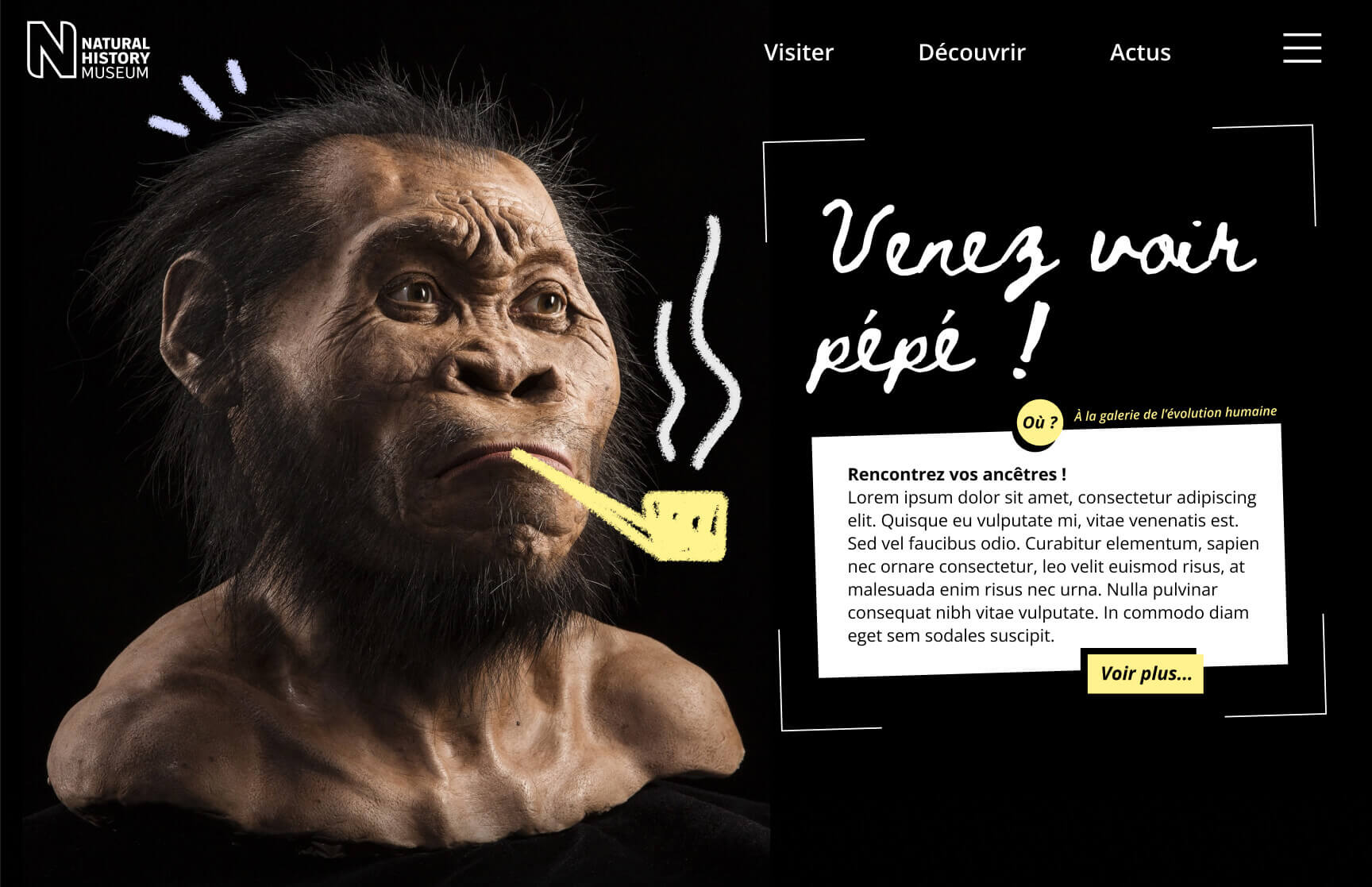 Ce musée possèdant de nombreuses thématiques, nous avons choisi de nous concentrer sur la partie homo-sapiens. Nous avons réalisé un moodboard en fonction de notre public visé, avec une volonté de rendre l'univers muséal accessible. Puis partant de cet outil, nous avons réalisé des visuels pour le web : site mobile, tablette et desktop, bannières ; et pour le print : affiches pour abri-bus. Nous devions aussi inclure dans cette campagne une carte stylisée du lieu et de son environnement, en suivant le moodboard.